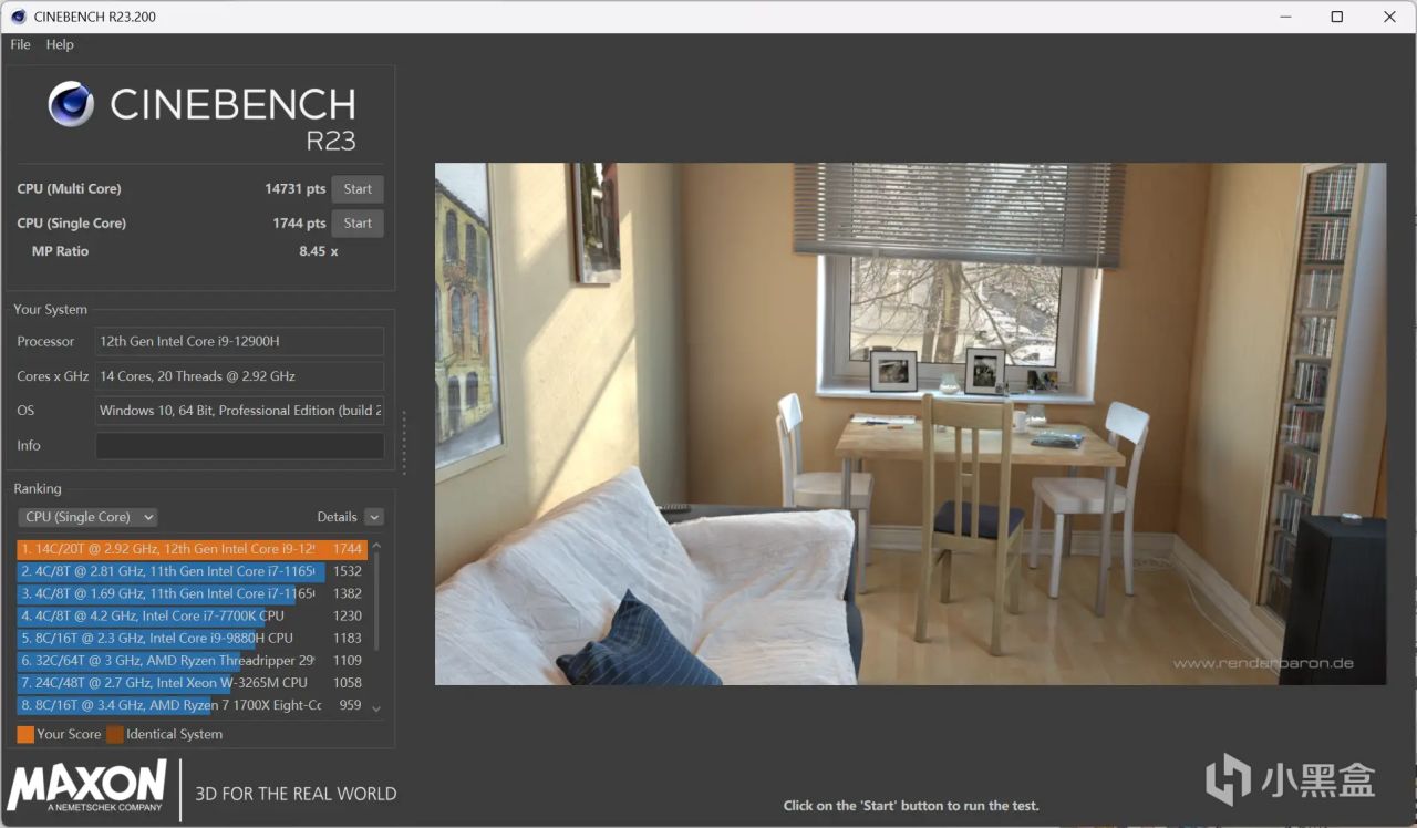 ▼使用CINEBENCH R23進行測試,多核成績14731粉,單核成績1744分。