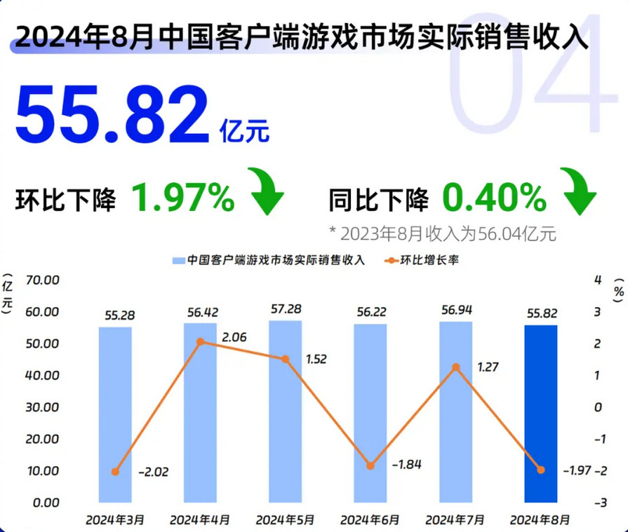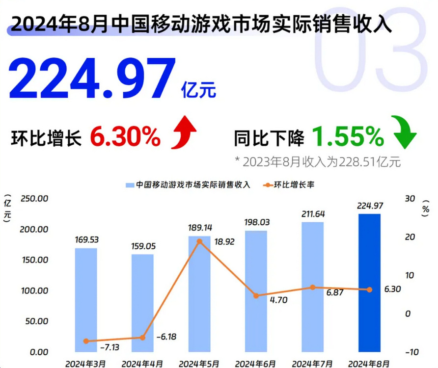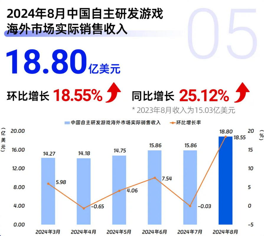 數據顯示,今年8月,中國遊戲市場收入336.4億元,環比增長21.01%,同比增長15.01%;中國自主研發遊戲國內市場市場實際銷售收入272.61億元,環比增長32.9%,同比增長9.35%;中國自主研發遊戲海外市場實際銷售收入18.80億美元,環比增長18.55%,同比增長25.12%