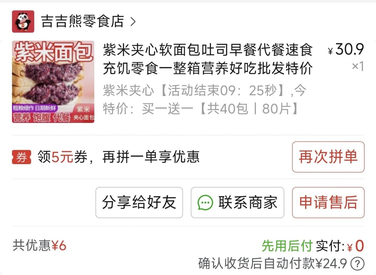 紫米面包我个人挺喜欢吃的,尤其是线下零售两块一大包的那个,可惜这款真的很小,封面图是好几个叠在一起,把所有的夹心都挤出来才拍出来的样子,买前有多期待买后就有多后悔,不过价格挺便宜的。