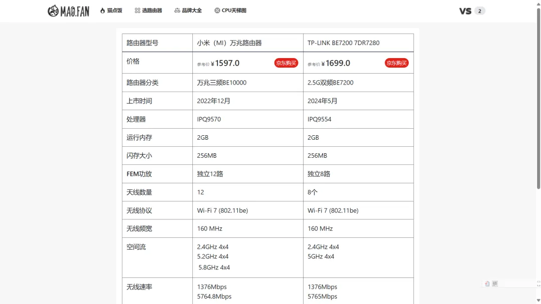 同時該網站也內置有CPU天梯圖,詳細記錄每款CPU處理器所包含的路由器產品,點擊即可查看,同時支持多款路由器進行線上參數對比,包含上市時間、處理器、運行內存等重要參數,一目瞭然。