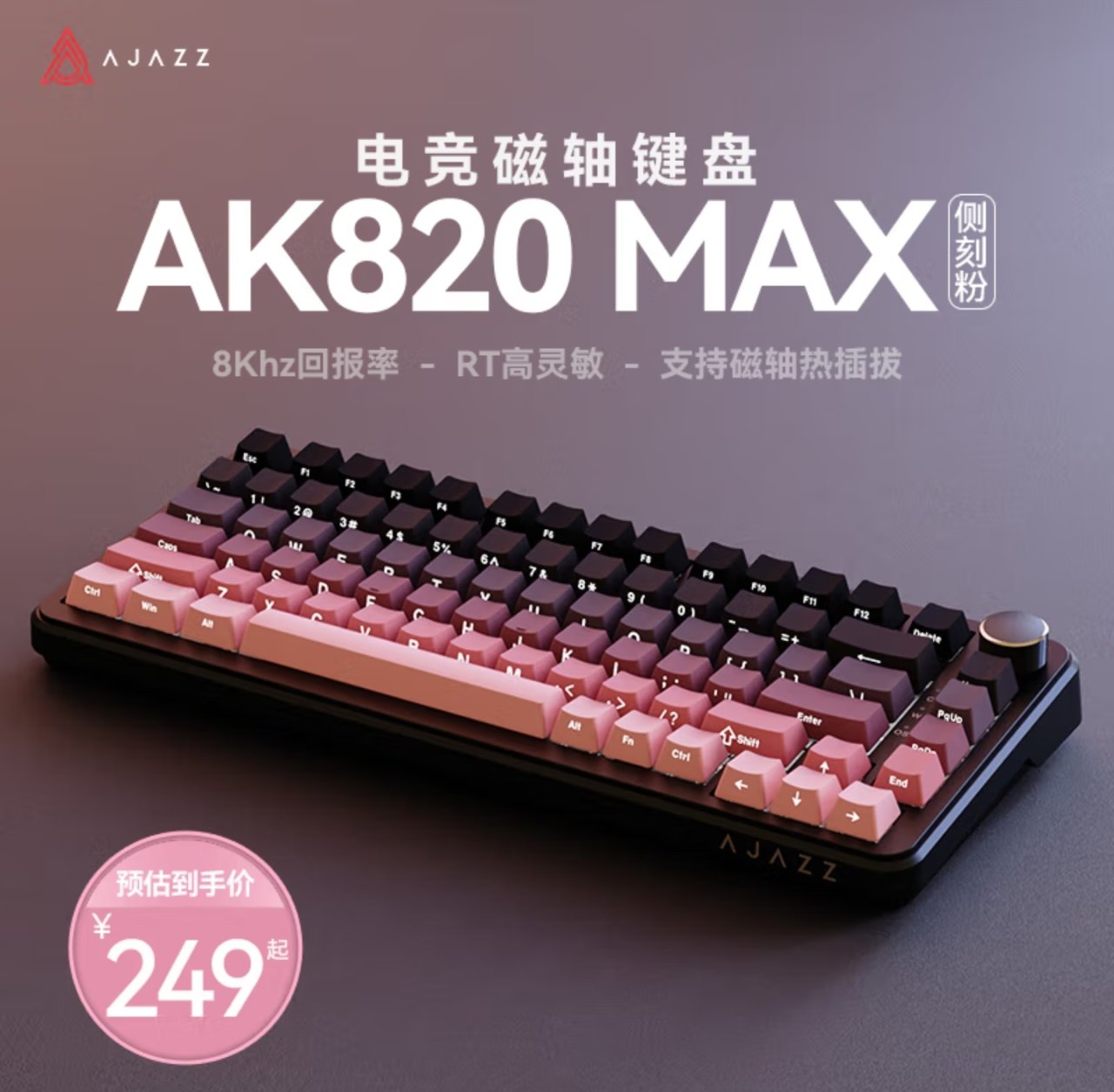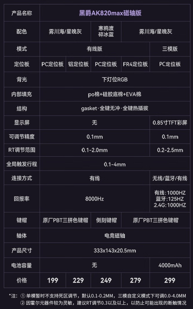 黑爵AK820磁轴版“黑莓粉”键盘的售价为249元,其他颜色有线起售价为 199 元。