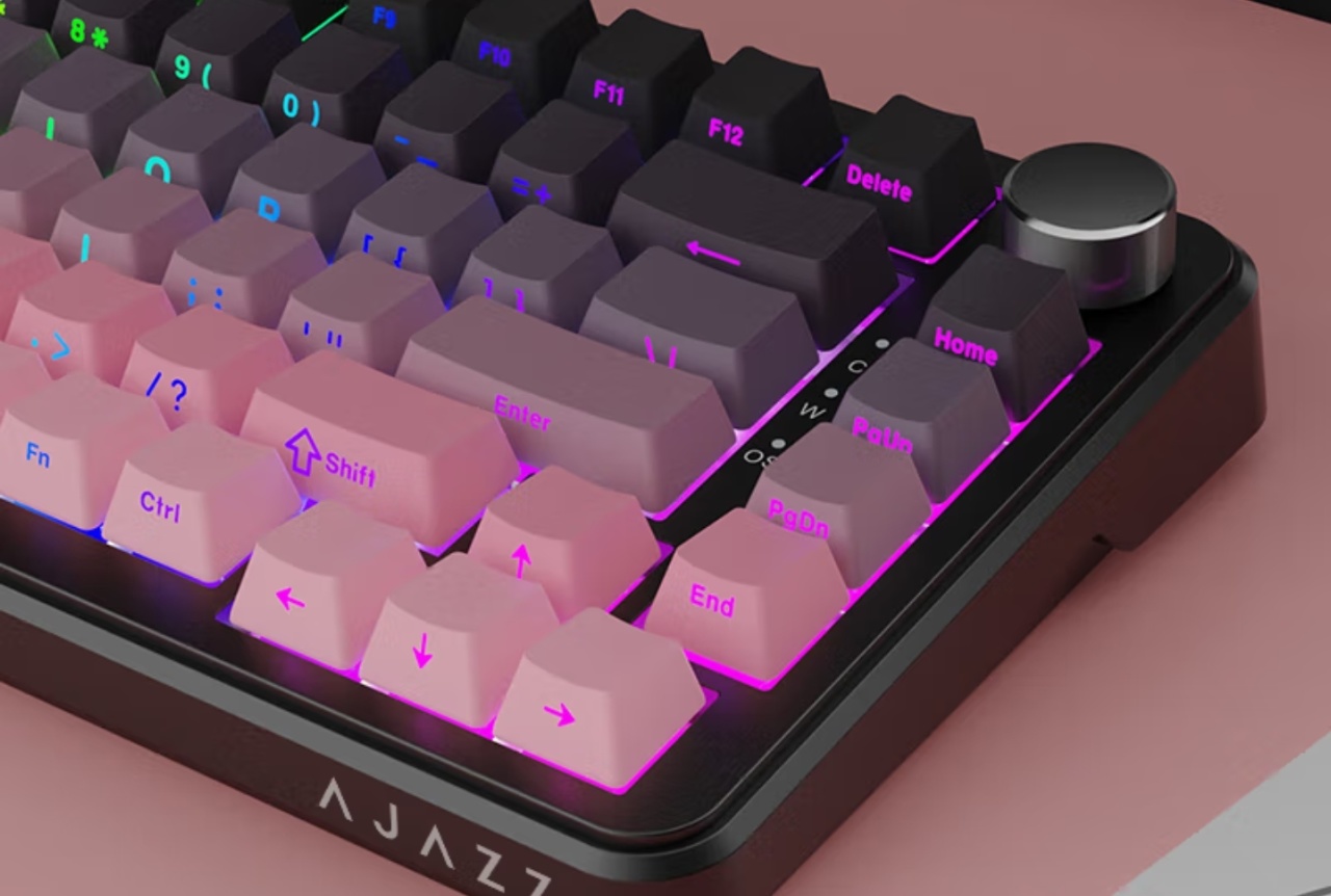 AK820磁轴版“黑莓粉”键盘采用了75%的配列设计,带有音量旋钮,支持有线连接。