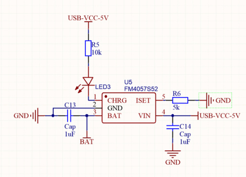 系统通过3.3V电给系统进行充电,使用的是小型锂电池,这个时候我们就需要使用电池充电电路了,对于锂电池充电我们采用的是芯片型号为:FM4057S52,由于锂电池电池对充电的要求比较大所以我们在选择充电芯片的时候需要更为严格,这芯片具有充满断电,以及过流断电,缓慢充电等优点,所以在充电的情况下是可以保证安全的。如下所示: