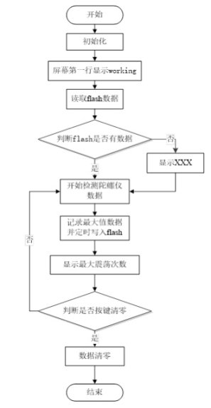 监测振动值方面,本设计每次按一下启动按键之后,开始启动检测工作,屏幕第一行显示working,记录运动过程中的最大振动值。三轴方向的都记录,将最大的一个轴向值显示在屏幕上第二行,系统不停的刷新检测,屏幕上永远刷新显示最大的一次震动值。同时,系统启动检测工作后,每隔2S写一次flash,将当前显示的最大值保存在flash里面。断电后开机重启屏幕会按照第一条需求显示上次的值,所以每次系统开机后,屏幕读取flash中保存的最大值,显示在屏幕上,如果flash中没有保存过数据则显示XXX,在检测工作状态,再次按一下按键,停止检测。屏幕显示最大值不动。外还有一个按键,按一下可以清除掉flash里面的数据,因为重新寄下一个包裹或者进行下一个运输环节的时候需要使用到清除功能,如图是本设计的软件设计流程图。