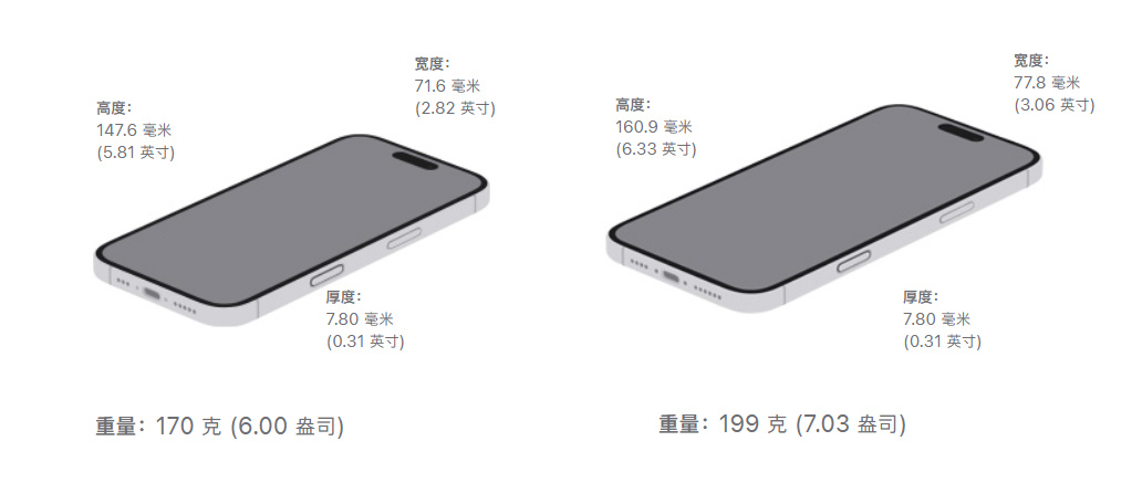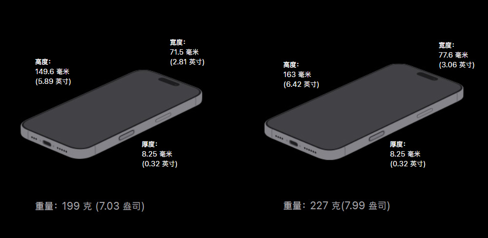 iPhone15 Pro(6.1英寸):146.6×70.6×8.25mm,187g;