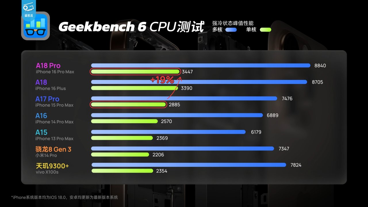 CPU對比A17Pro提升15%,同性能功耗降低20%。