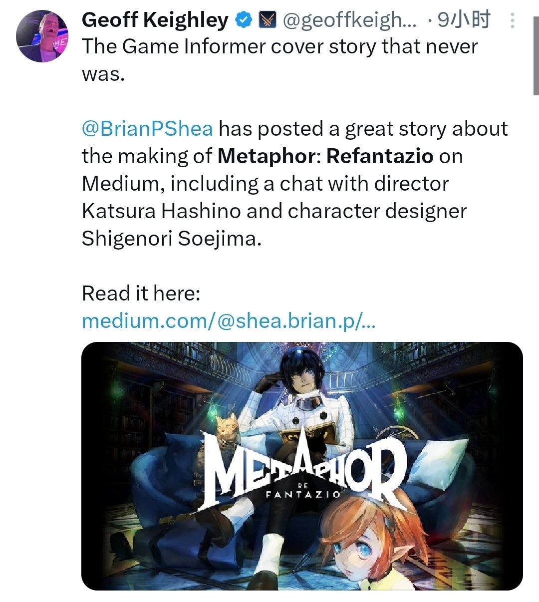 此外,TGA创始人杰夫转发了一篇深度采访《暗喻》团队桥野桂和副岛成记的文章,由于里面涉及开头剧情的详细描述,不宜剧透,感兴趣的可自行浏览。