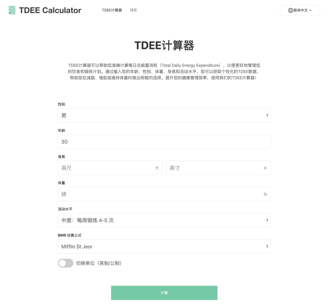 输入性别、年龄、身高、体重、活动水平、BMR估算公式,即可一键计算TDEE。