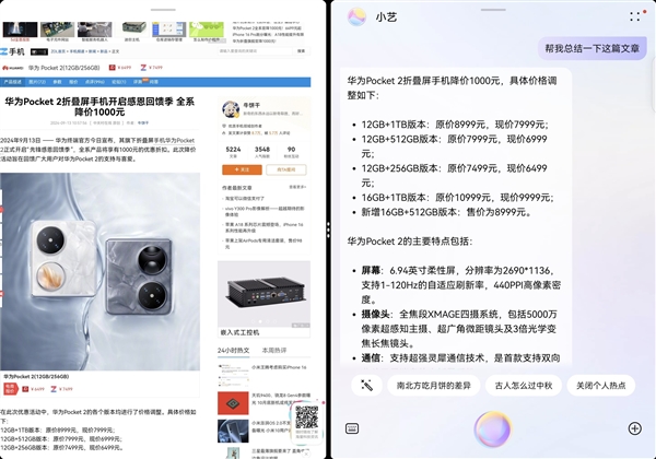 就比如當我看到了一篇華爲Pocket2降價促銷的新聞時,就可以讓小藝幫我們總結文章,快速瞭解到這次降價促銷中每個內存版本的具體降價幅度以及降價後的價格,同時小藝還會幫我們總結華爲Pocket2的核心亮點是什麼,幫助我們快速瞭解產品。