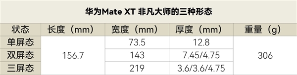 機身尺寸上,我們給大家整理了Mate XT 非凡大師三種形態下的尺寸,最薄3.6mm的機身厚度在上手時還是挺震撼的,經常會讓我擔心折斷;306g的機身重量,相較於傳統直板機和摺疊屏來說,確實要重上一些,但這應該也是三摺疊產品目前在重量上能夠達到的技術頂點了。