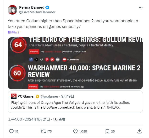 與此同時,網友表示,一個給《指環王:咕嚕》打分(64分)比《戰錘40K:星際戰士2》(60分)還高4分的遊戲媒體,叫我怎麼相信你呢?