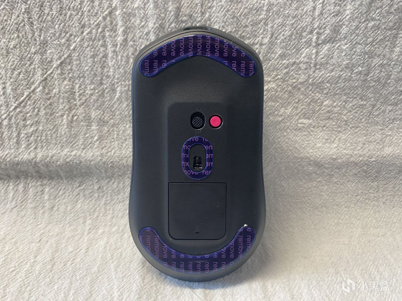 接下来说到鼠标的背面,背面其实相比于之前的VT9系列来说并没有很大的改变,传感器处于正中,两个按钮一个是电源开关一个是自定义按钮,自定义按钮出厂默认功能为切换USB回报率,可以在驱动中进行功能更换,至于最下方的这个正方形,那就不得不提这款鼠标的又一个亮点了。