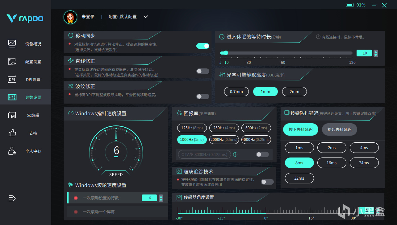 而且最重要的是,这个驱动不仅酷炫,功能也是相当之多,不仅可以设置移动同步、直线修正、波纹修正等诸多功能,还能设置按键防抖延迟,3950的玻璃追踪技术也可以设置以及传感器角度设置,甚至是OTA8K回报率的开关也在这里,可以说,雷柏的驱动中的功能数量,也是所有品牌厂商中的独一档,你想要的,这里真的全都有。