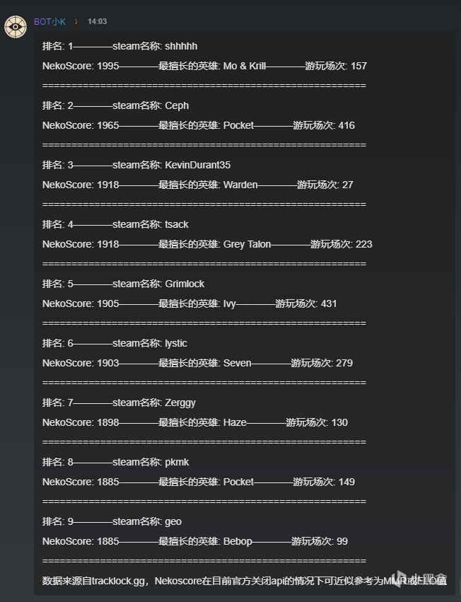 诚然,部分数据确实比较极端,游戏平衡也在不停的进行中,但是没有排位也没有ELO,大家对自己的实力也没有清楚的认知。就在前几天,Nekoscore上线了,作为ELO的替代品,通过追踪游戏内的比赛记录等,计算出每个人的近似水平,从300分开始计算,最高的已经抵达了2000分。