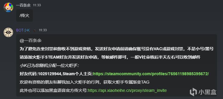 什么,都这么久了你还没有资格?或者你也想加入火炬手的行列帮助更多新玩家?来传火频道就对了,在这里发送"/传火"之后,bot会随机给你从火炬手当中抽选一位,添加好友后等待v社审核就可以了哦。但是为了大家账号的安全,时长不够的小号、有VAC记录或者私密账号不能通过好友申请哦,还请各位理解~~~