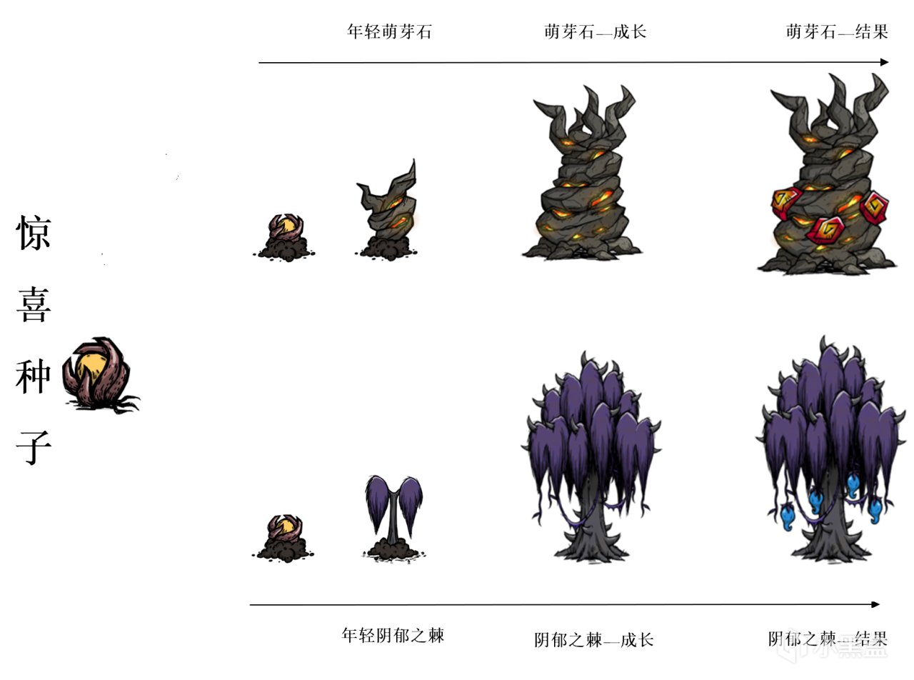 ①有概率生成在沉底寶箱中,生成於沉底寶箱中的驚喜種子會帶有隨機的屬性(陰鬱之棘或者萌芽石)。由陰鬱之棘或萌芽石掉落的驚喜種子會繼承原本的樹所擁有的屬性。