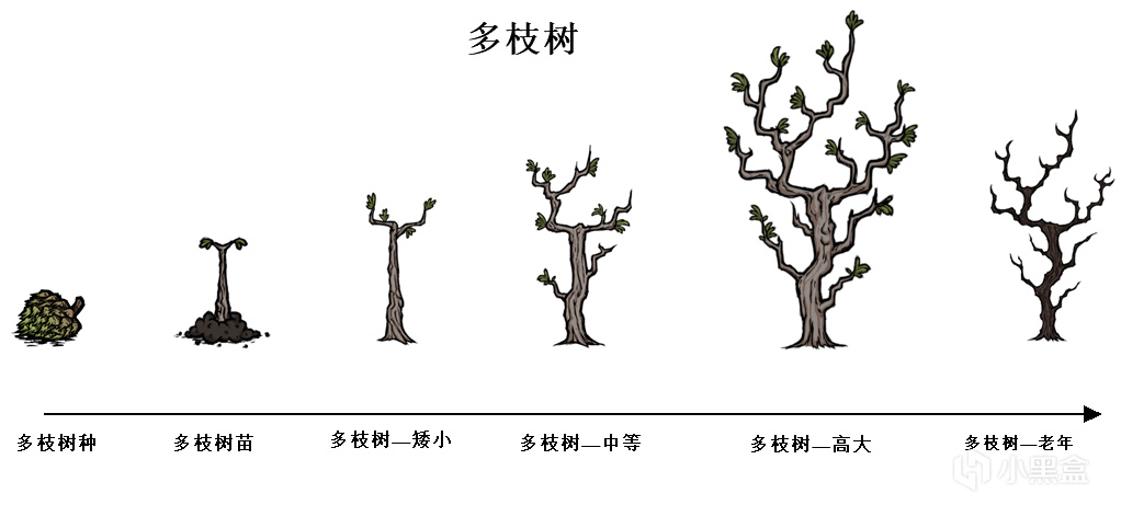 ②種植多植樹後,當多枝樹從年老階段轉換爲矮小階段時,會有幾率生成樹枝。如果周圍8距離單位範圍內有2個或以上樹枝,則不生成樹枝。