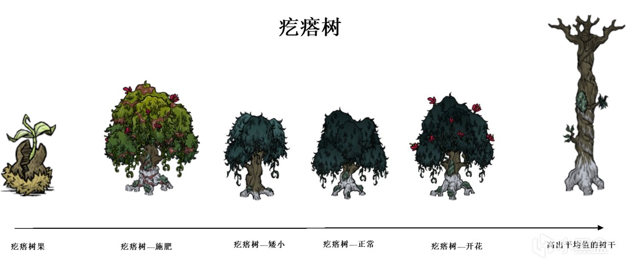 ③常青樹擁有四個生長階段,並在這些階段中循環生長。常青樹苗、樹樁、燒焦的樹不屬於這些生長階段。