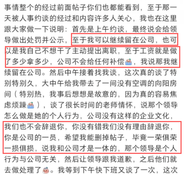 大家纷纷给她出招,让她一定不要删除帖子,如果后续公司给她穿小鞋,她就继续更新这件事。