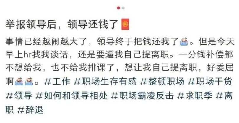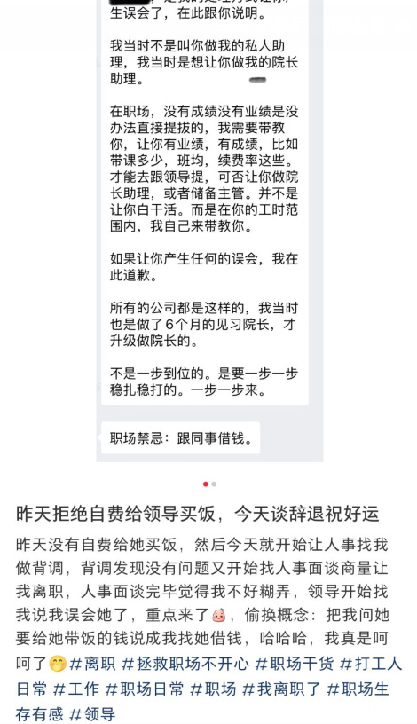 这之后,虽然领导把之前的饭钱还给了她,但公司的hr却一直在逼她离职。
