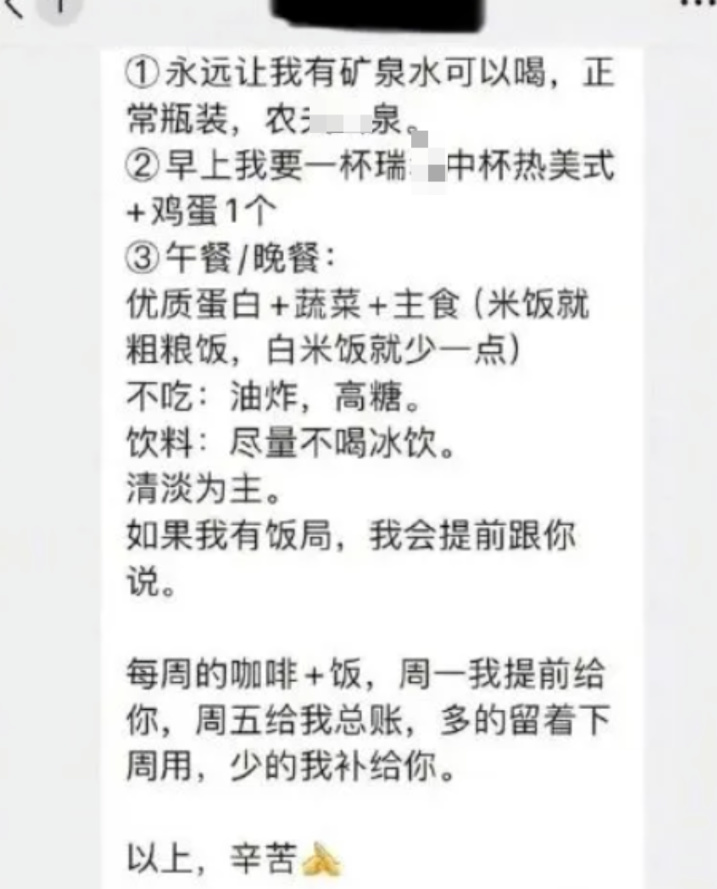 该网友称其工作时被领导要求做私人助理,并要求每天带矿泉水、一日三餐和咖啡,她向领导要求先给饭钱遭拒,领导称“没钱靠自己赚,不能问我要”。