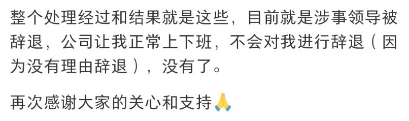 该网友称,这名领导被辞退后,事情看上去告一段落,但实际上,自己后面的上班日常应该会非常困难。