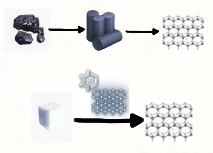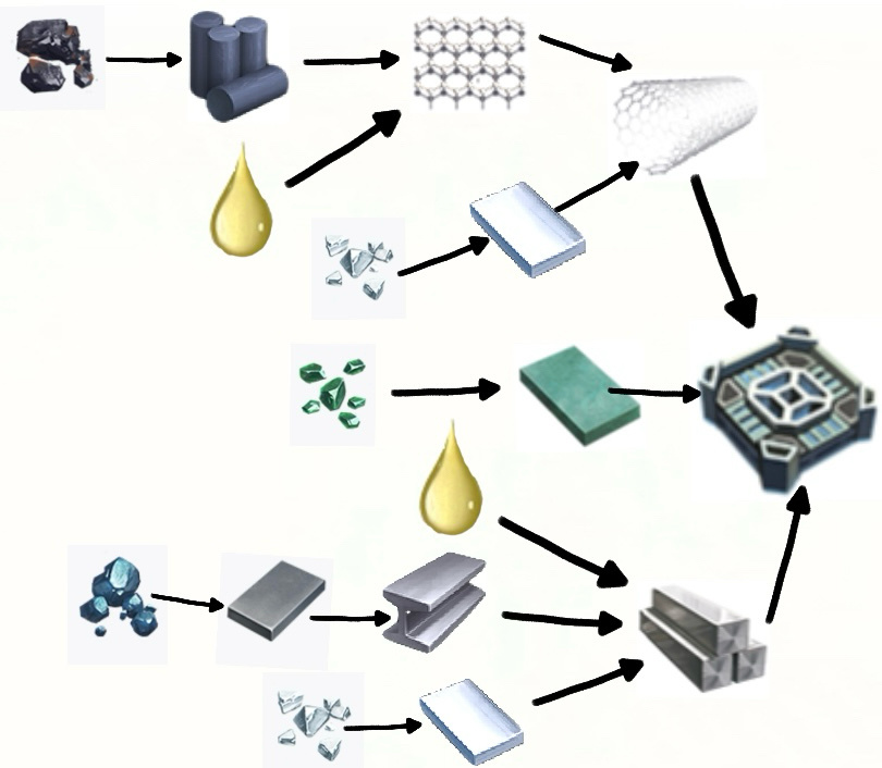 當所需材料的產能跟不上需求量時,這時候就需要增加所需材料的產線。但一個母材料可能需要幾個子材料,子材料還需要它的子材料,較爲高級的材料這樣的子分支更多,列舉一個如下圖,這種從最初礦產一步步往上合成的鏈佈置起來是極其消耗時間也極其上頭有成就感的。