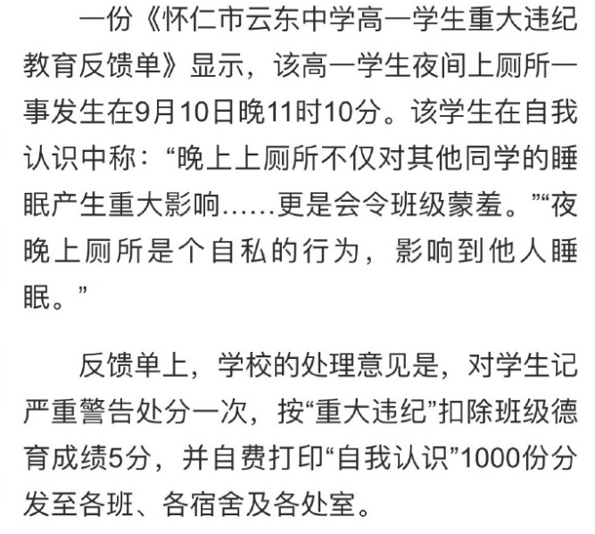 近日,山西懷仁市一高中生因在晚上上廁所,被學校記嚴重警告處分,並自費打印“自我認識”1000份分發,此事引發熱議。