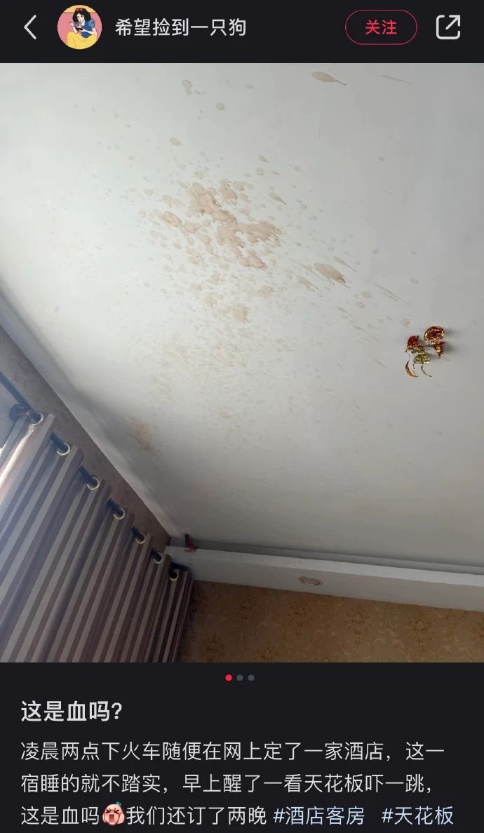 17日,內蒙古,網友發帖稱凌晨兩點下火車在網上隨便訂了一家酒店,迷迷糊糊一夜沒睡踏實,第二天醒來發現頭頂的天花板上有疑似血跡的東西。
