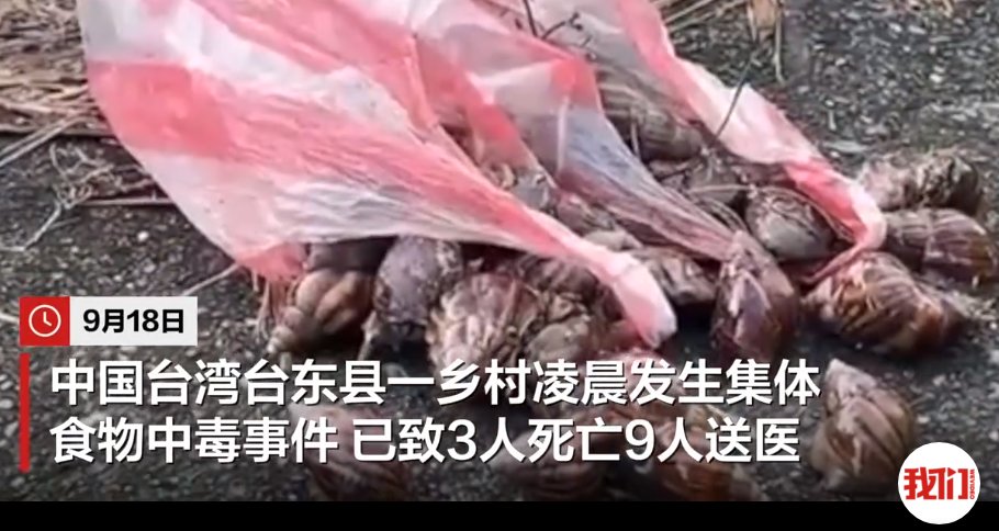 9月18日,臺灣省臺東縣一鄉村凌晨發生集體食物中毒事件,已致3人死亡9人送醫。
