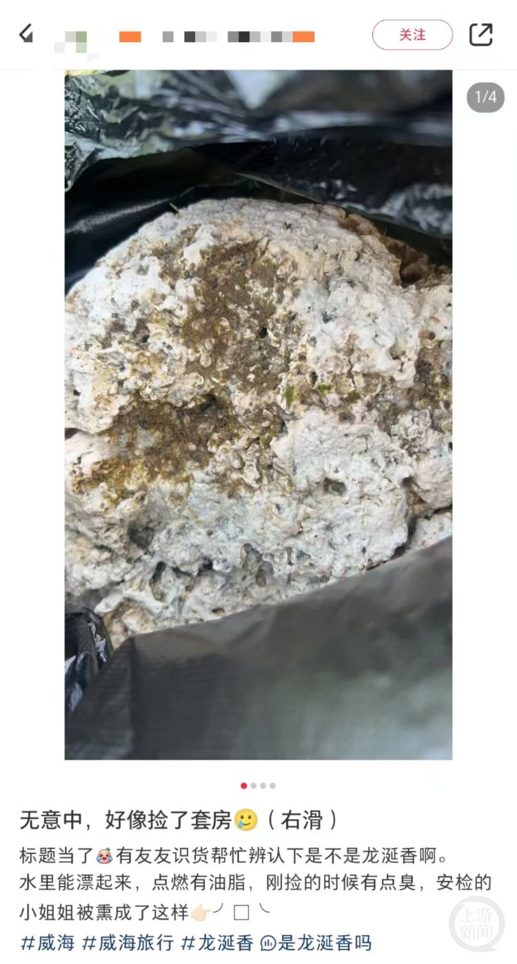 近日,一名北京網友發帖稱,自己到山東威海旅遊時,在海邊趕海撿到一塊約2斤重的物體,懷疑是龍涎香(一種昂貴的定香劑原料)。