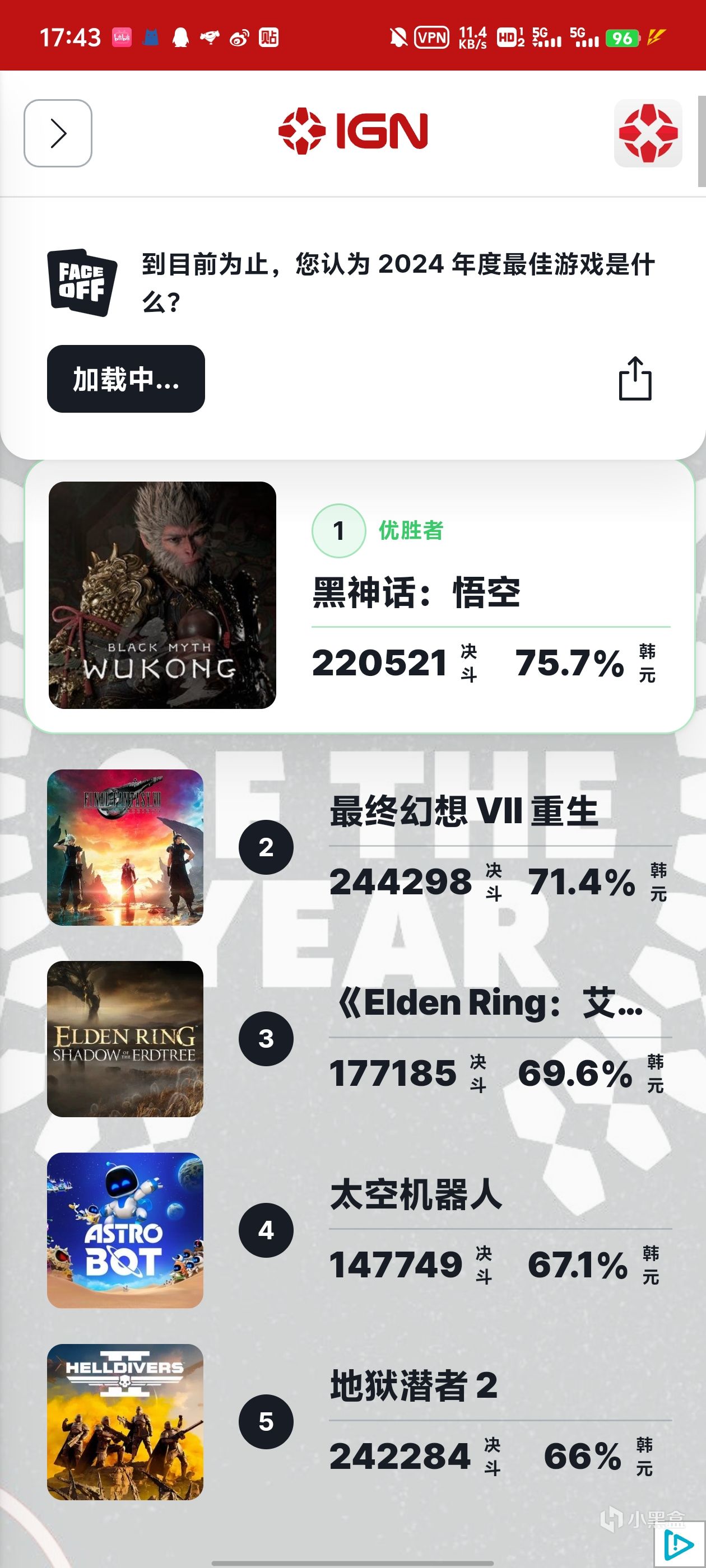 就在今天早上,IGN的投票活動《黑神話:悟空》的支持率順利突破90%,領先第二名《最終幻想Ⅶ:重生》接近19個百分點,可以說是力壓羣雄了。