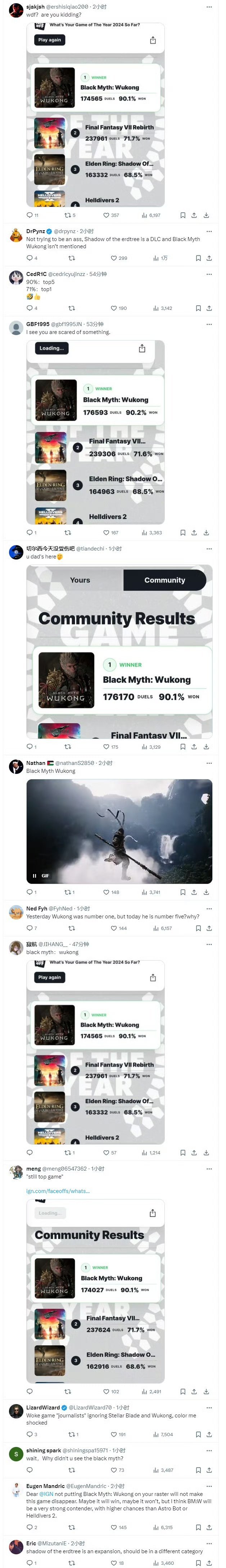 玩家对这种“玩不起”的行为自然丝毫不买账,在IGN推文下的评论区,大量玩家直接晒出了投票活动的成绩单:《黑神话:悟空》以高达90.1%的支持率排名第一,以此来回应IGN强行安排的第五名。性子比较直爽的玩家直接开喷: