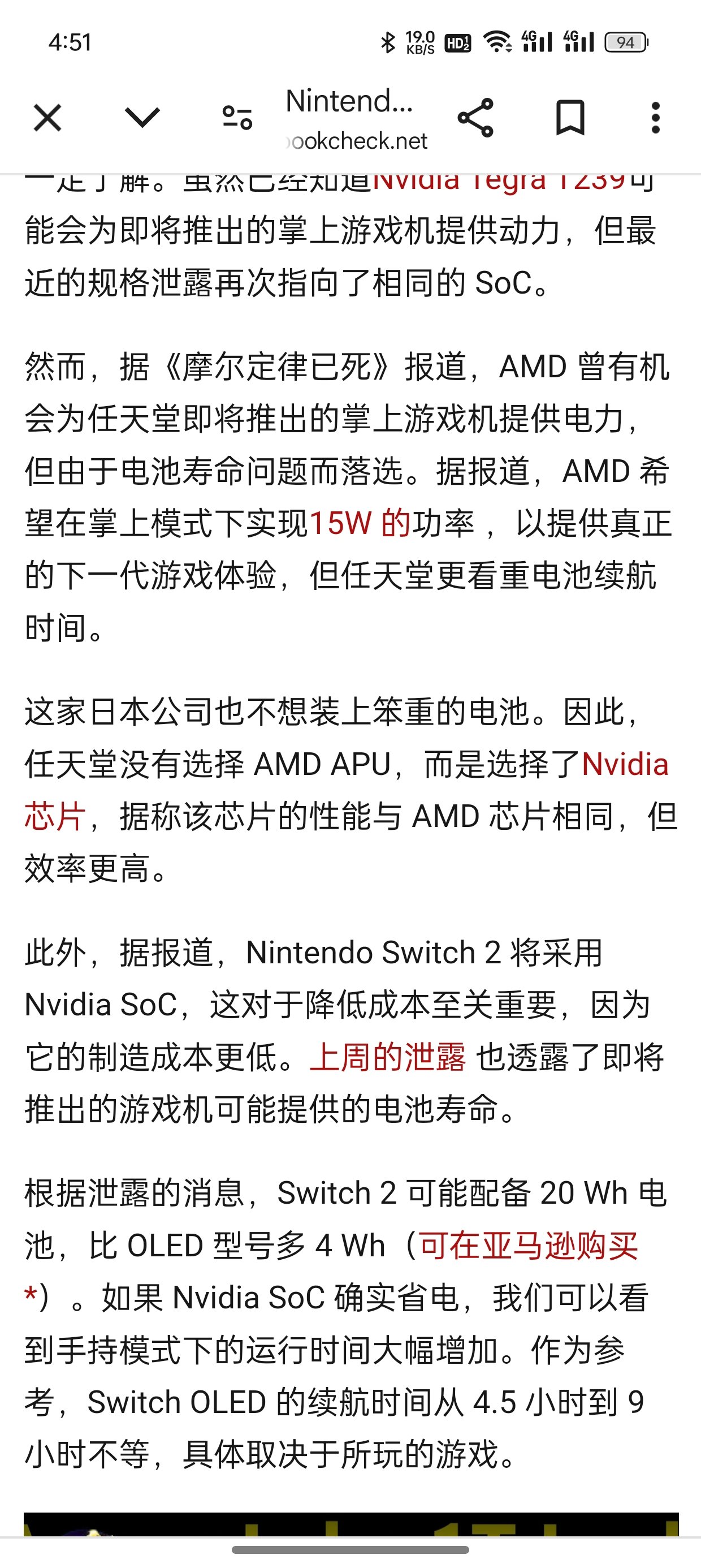 任天堂Switch 2預計將在2025年4月前發佈,最近的泄露信息透露了一些新特性。雖然之前已知Nvidia Tegra T239可能成爲新掌機的處理器,但最新的規格泄露再次指向了這款SoC。AMD曾有機會爲任天堂的新掌機提供芯片,但由於電池續航的考慮而失去了競標機會。AMD希望在手持模式下將功耗提升至15W以提供更強大的性能,但任天堂更傾向於更長的電池使用時間,因此選擇了Nvidia的芯片,該芯片在提供與AMD相同性能的同時,能效更高,製造成本也更低。