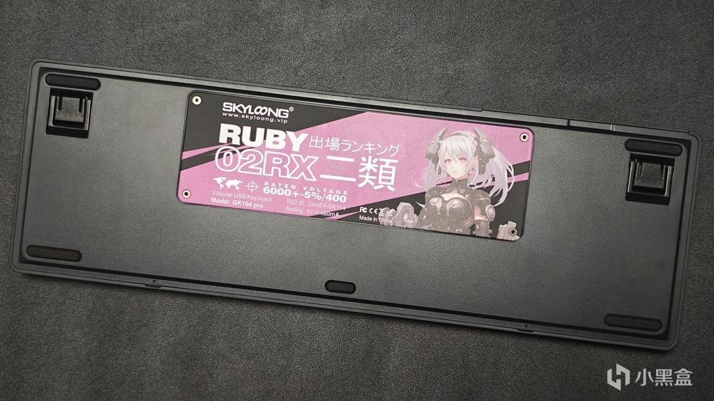 键盘背面除了5个防滑垫以及一对二段式脚撑以外,还有一块铝合金装饰背板,与键帽主题配色呼应,非常好看.