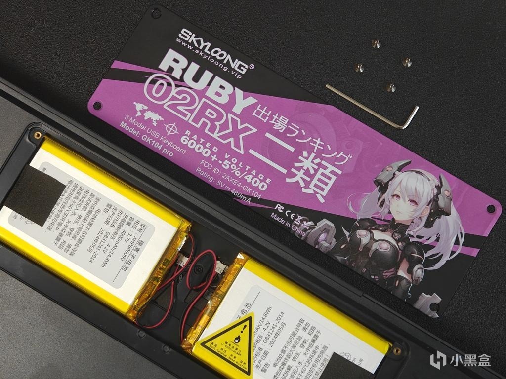 内置锂电池的键盘最怕时间久了电池坏了,这把键盘铝合金装饰背板通过四枚螺丝固定支持拆卸,这样换电池就非常方便,里面装了两块4000mAh的锂电池,很够用。