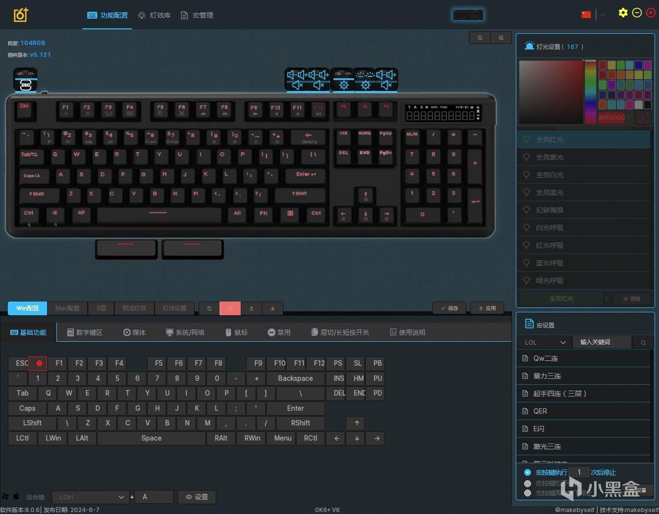 GK104Pro采用“极客定制”的GK6XPlus V8驱动,驱动主页分为:功能配置、灯效库和宏管理三大板块;这款驱动的功能非常丰富,支持不同的系统和多层编辑,三枚金属旋钮的功能也可以自定义,很强大。