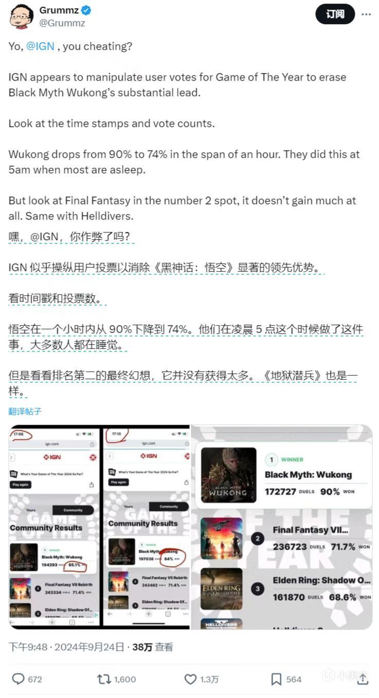 昨日晚间九点,前暴雪制作人Grummz发帖指责IGN疑似作弊。