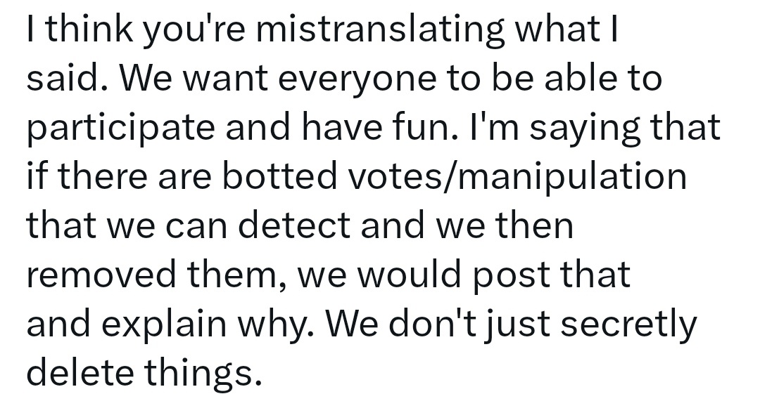 我覺得你誤解了我的話。我們希望每個人都能參與其中並享受樂趣。我的意思是,如果我們能檢測到機器人投票/操縱行爲並將其刪除,我們會發布並解釋原因。我們不會偷偷刪除東西。