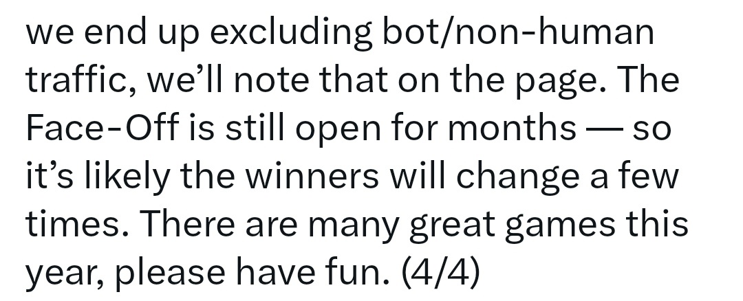 我們最終排除了機器人/非人類流量,我們會在頁面上註明。網站投票仍會開放數月﹣因此獲勝者可能會改變幾次。今年有很多精彩的比賽,請玩得開心。
