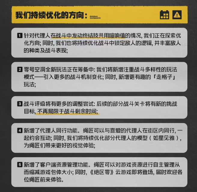 策劃預計在1.4版本會對前期1-3章的主線也進行大規模重置,像1.2版本主線一樣去除走格子模式,保證玩家在過主線時的連貫性和代入感。並且在未來已經規劃好會增加電量供給、材料掉落、商店可兌換內容,並增加更多樣的戰鬥評價條件,豐富怪物種類,打磨角色模型和鎖敵邏輯,可以與喜愛的代理人約會互動的同行功能也讓人期待。力求爲玩家減負,去除痛點的同時,保留並增加爽點,讓玩家更單純地享受遊戲的樂趣。
