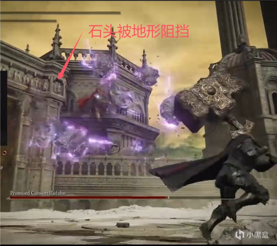 接着我打到boss二階段時候,boss會有一招飛天扔石頭的招式,可能是巧合,boss莫名其妙地就被我打到了牆角,導致了他的石頭會被場地邊緣的地形卡沒了,這個時候我就可以瘋狂地輸出,非常安全。