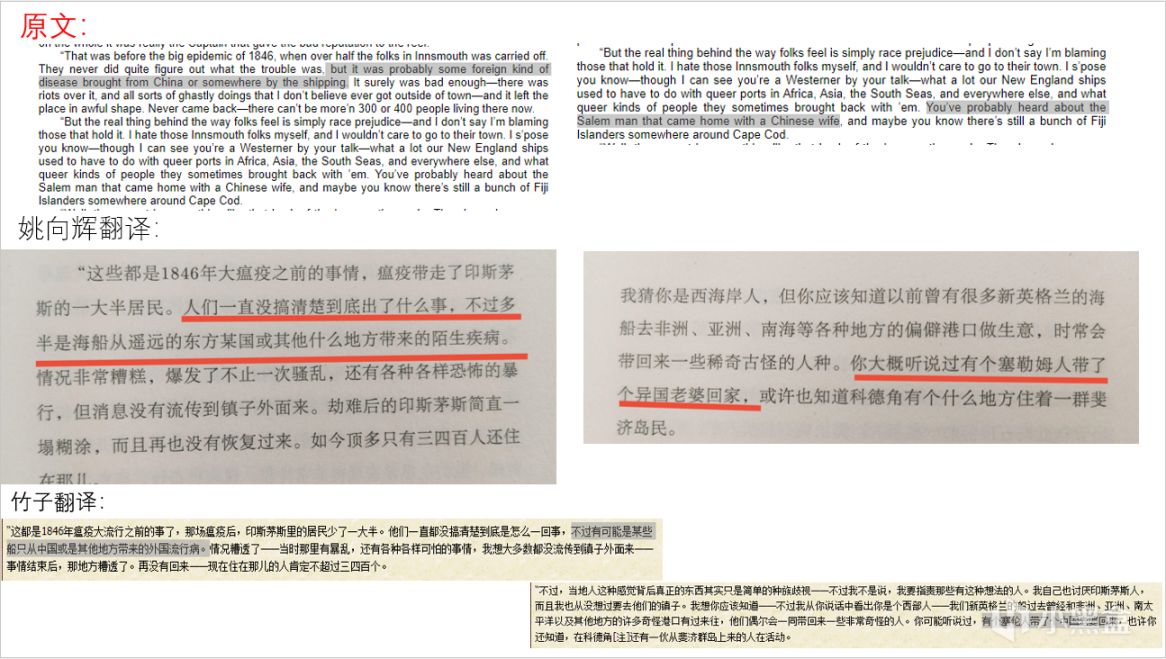 就前兩本《克蘇魯神話》來說,姚向輝翻譯的不僅有些晦澀難懂,而且有的些詞並未直譯,不知道他在忌諱什麼。下面我做了一張PPT,讓你們直觀地感受一下不同的翻譯,大家自行評價(竹子的翻譯在trow論壇於2012年發佈)