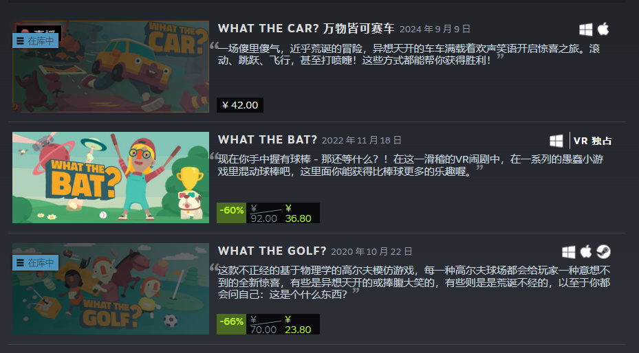 這其實是“WHAT THE XXX”這個系列的第三款遊戲了,第二款《WHAT THE BAT?》是VR獨佔的所以我沒玩過,但系列首作《WHAT THE GOLF?》和這個九月份的新作《WHAT THE CAR?》我都玩了,可以說新作在荒誕搞笑且腦洞大開的獨特氣質方面完全繼承了該系列的精髓。