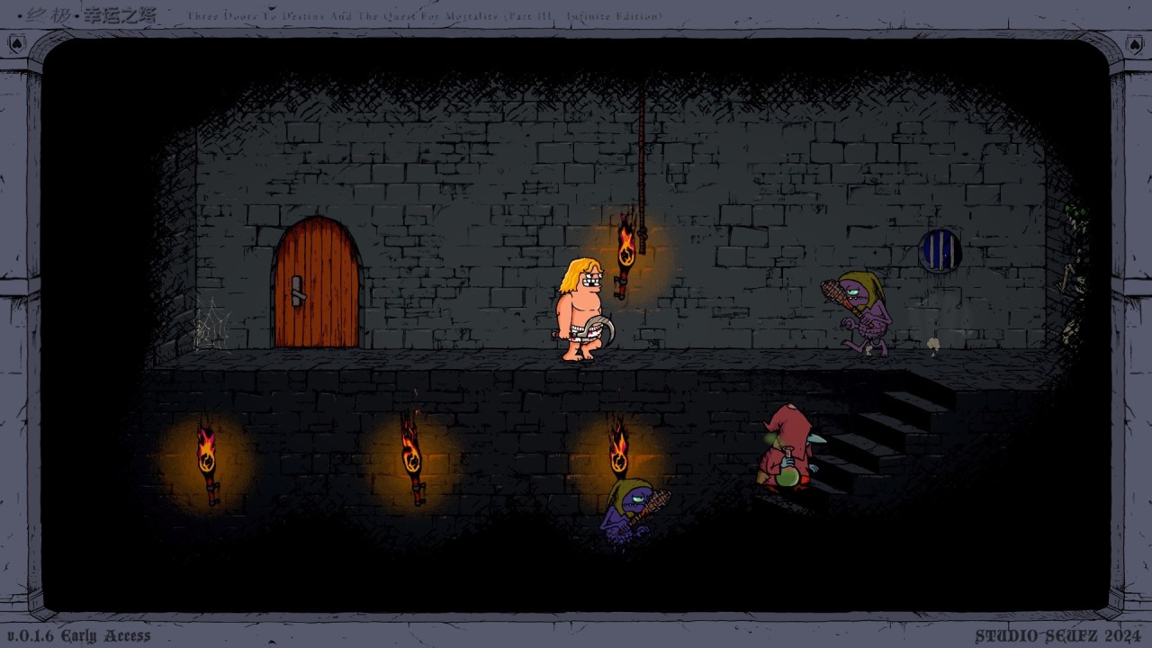 這個遊戲主打的是一個惡搞的氛圍。《終極幸運之塔》可以說非常簡單,但也可以說非常抽象。玩家扮演一個黃毛在一座到處都是門的塔樓裏面進行探索,目標是逃出塔樓。你不會知道門後面是什麼,因爲這個遊戲每一局都是系統隨機生成的,在探索過程中會遇到什麼怪物、撿到什麼道具、遇見什麼謎題,全是未知數,有些還非常抽象,比如突然從牆壁裏衝出來把主角砸扁的大錘怪物,或者是出一些奇怪謎題、如果答錯就秒殺主角的謎語人。主角的死法可謂千變萬化、令人忍俊不禁,胡鬧搞怪的氣息貫穿始終。