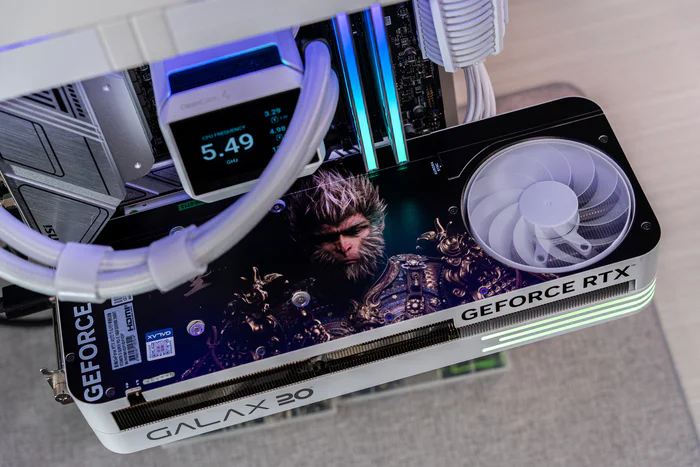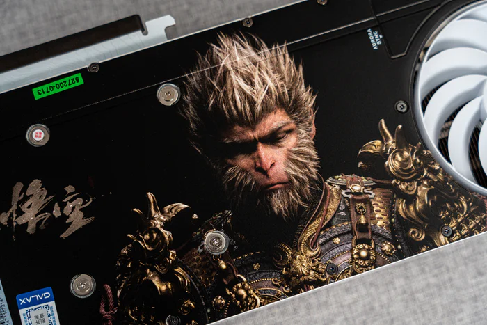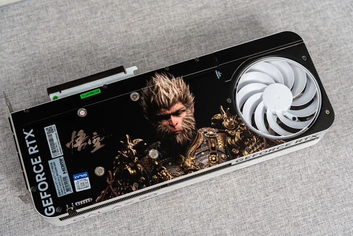 显卡正面的散热上作了“黑神话:悟空”的场景图案,显卡的背板也是做了黑神话:悟空的涂装