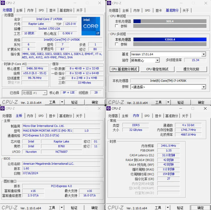 CPUZ 测试14700K的单核909.4分,多核13950.4分