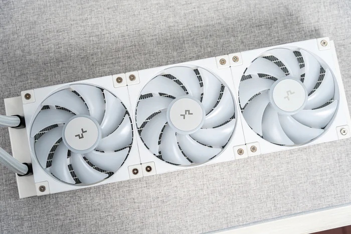 冷排上使用了3把DF12ARGB风扇,扇框采用全包胶设计,6颗第二代ARGB光珠,性能方面600-2400RPM区间下可提供最大风量72.04CFM、最大风压3.48mmAq,满载噪声38.71dB(A)