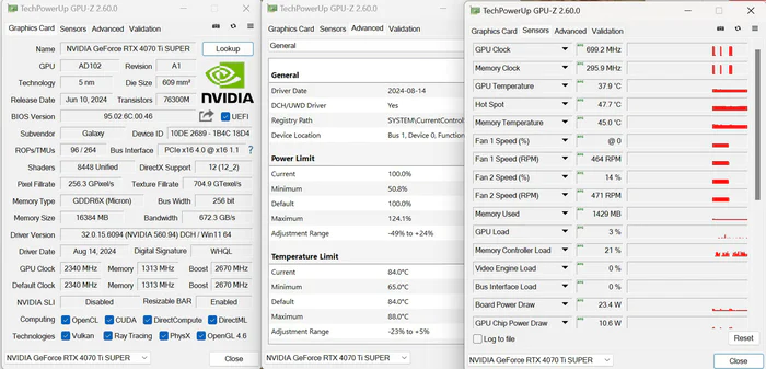 显卡核心依然是TSMC 4N工艺、NV Ada Lovelace架构,提供了96组SM单元,8448cuda处理器,显存是16GB、256bit、21Gbps速度的GDDR6X显存,基础频率2340MHZ,并有双BIOS设计,P-mode加速频率2670MHZ(295W MAX366W)、S-mode加速频率2610MHZ(295W),尺寸含挡板为344*152.3*60mm、不含挡板330*137.7*60mm