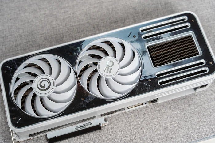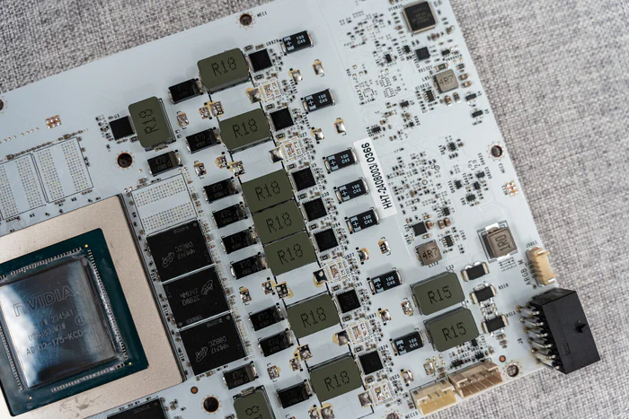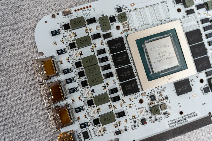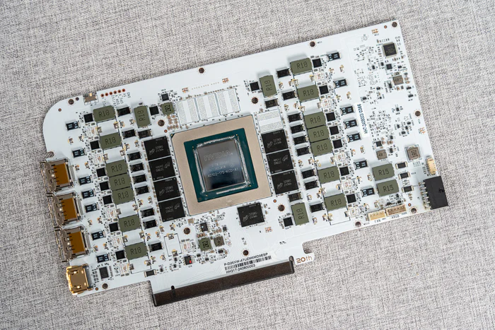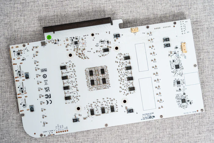 看完散热器,接下来看PCB,14层纯白PCB,整体规格可以看到为14+3相贴片供电元件,对于4070TI SUPER来说已经是相当豪华的用料